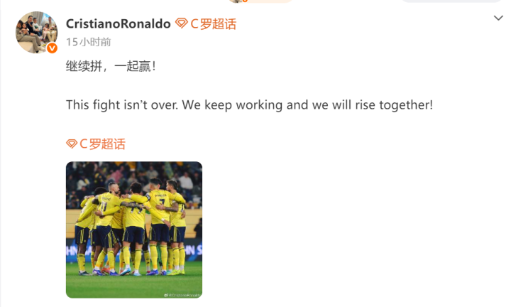 尽管是这样的情况,C罗的自信一点都没有受到影响,在输给胡拜尔库迪西亚那场比赛之后,他立刻在INS上面晒出了全队在更衣室的合照,并且配上了上述那段励志的宣言,没有提到自己状态方面的问题,之前接受沙特媒体采访的时候,他也屡次强调“球队正行进在正确的路上”“失利是成长的一部分,一定要继续努力” 。