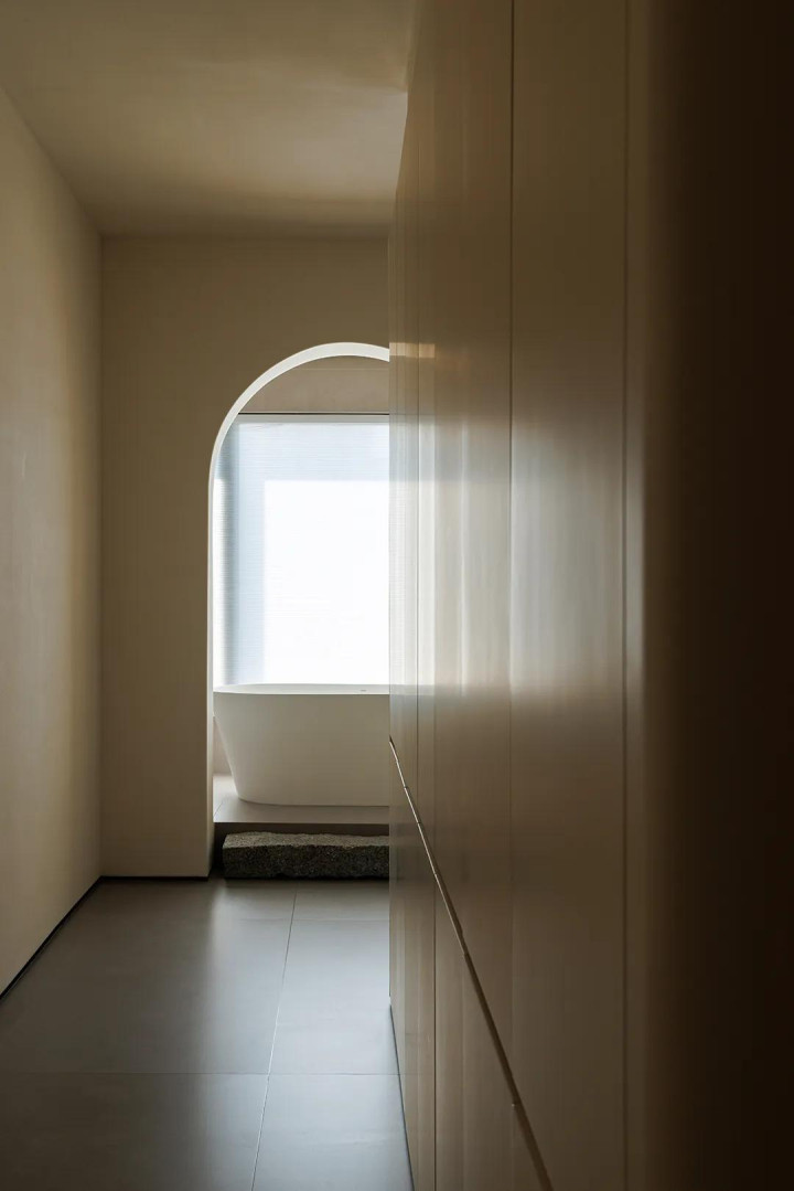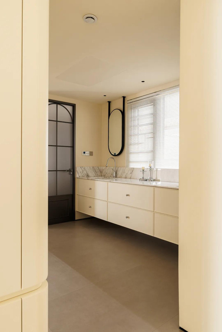 与书房相依的独立浴缸,打破了功能主义的桎梏,当蒸汽氤氲过书页,材质间的对话便超越了传统认知——岩板与橡木,绒布与黄铜,都在奶杏色的统摄下达成微妙平衡。