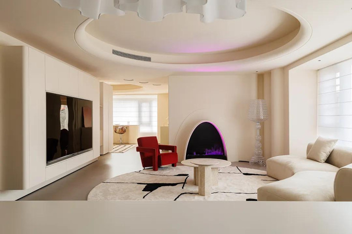 客厅的圆顶吊顶宛如天穹倒扣,倾泻下柔和的漫射光。侧墙那道拱形暖炉,既是加湿装置更是视觉锚点——当屏幕跃动火光,琉璃色灯光在暮色中流转,整个空间便成了演绎四季的沉浸剧场。