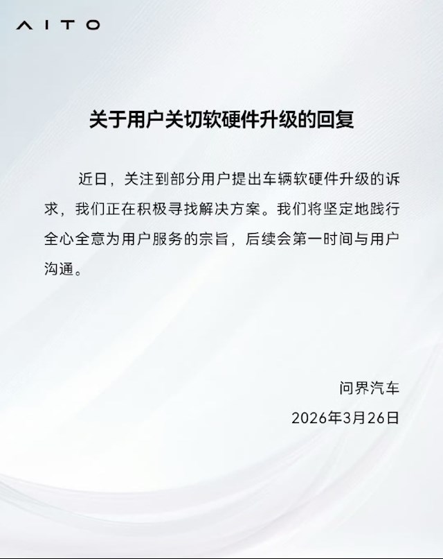 对此,问界用户服务公众号发布了《关于用户关切软硬件升级的回复》,称正在积极寻找解决方案。